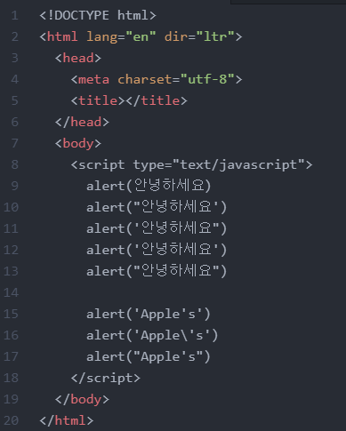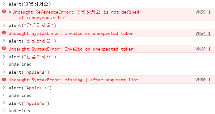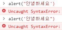 문자는 "(큰 따옴표) 혹은 '(작은따옴표) 중의 하나로 감싸주어야 합니다.