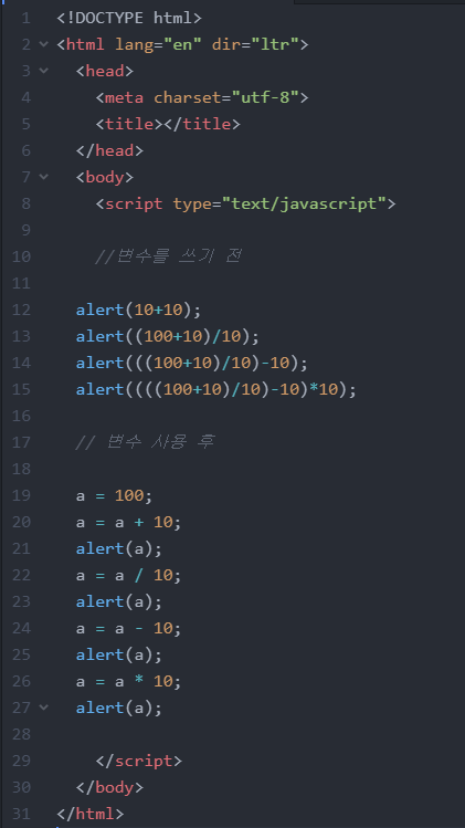 앞으로 당신이 코드를 작성하는데 있어서 중요한 변수의 효용성에 대하여 짚고 넘어가 보도록 하자.다음 코드를 보았을 때 변수를 쓰기 전과 후가 있다.변수를 쓰기 전에는 일일이 숫자 값을 넣어 계산을 하였고,변수를 쓴 후에는 그때 그때 상황에 따라 변수값에 새로 추가된 수식만 추가 되는 식으로 코드가 작성 되었다.